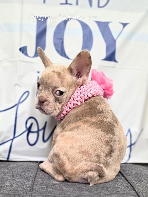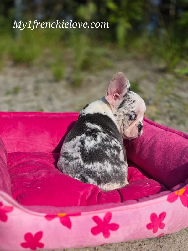 This girl is a black merle frenchie from Darla x Maximus. She is thick and short with big open nares and beautiful big eyes that look deep into your heart! This girl is simply beautiful and has a nice short coat.