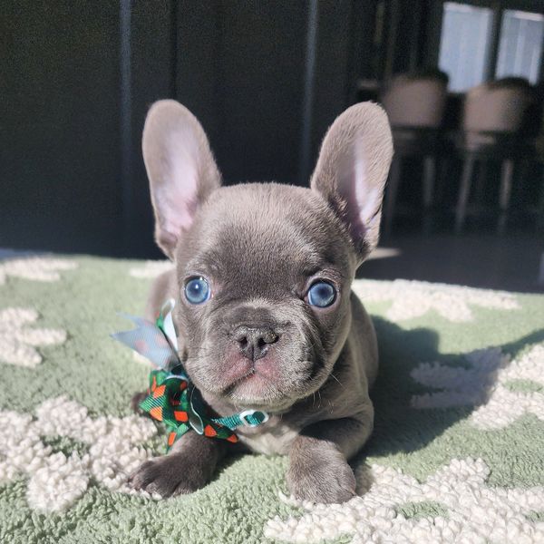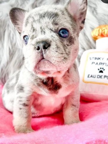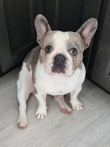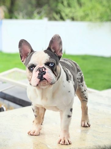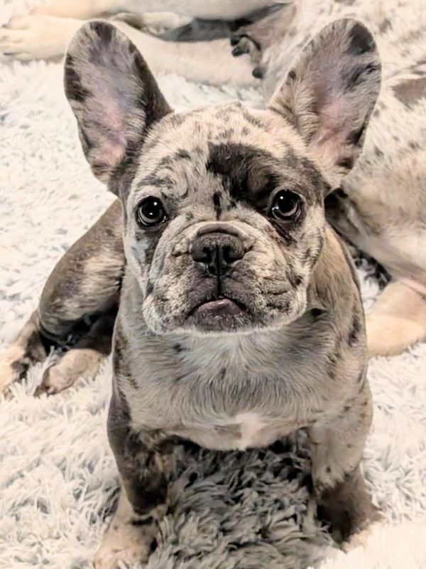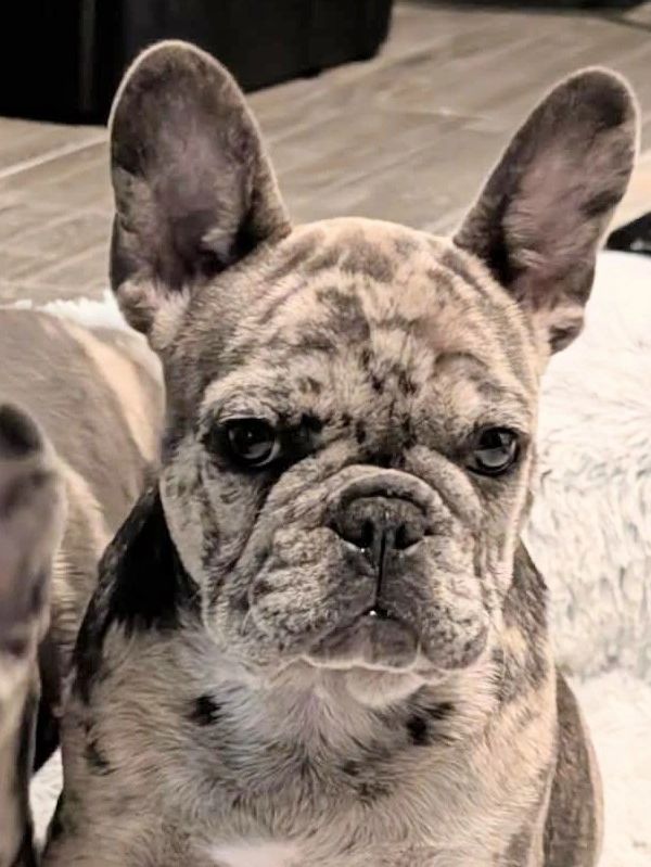 This boy is a black merle frenchie from Darla x Maximus. He is an amazingly colored frenchie! His mom is small and dad is 19lbs of loving goodness. Expected weight is around 25lbs.
