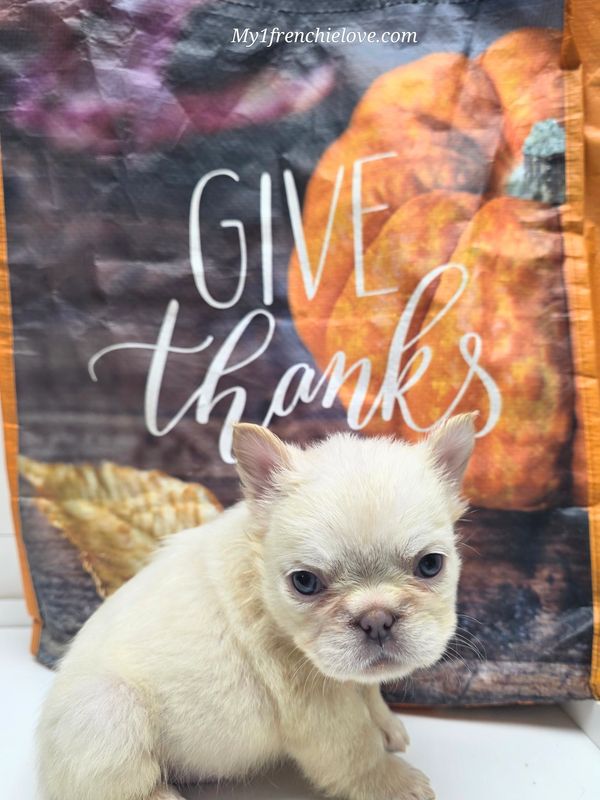 This girl is a cream fluffy frenchie from Keerah x GSPT. She is a perfect size, thick and short with big open nares. She is a straight snuggle bunny.