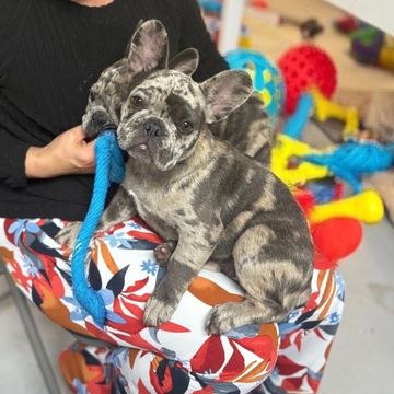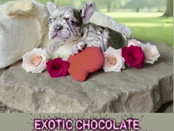 This puppy is a chocolate merle French Bulldog with a dreamy expression and the softest features. Her gentle marbled blue eyes and delicate structure give her a sweet, heavenly vibe like a soft melody in puppy form.